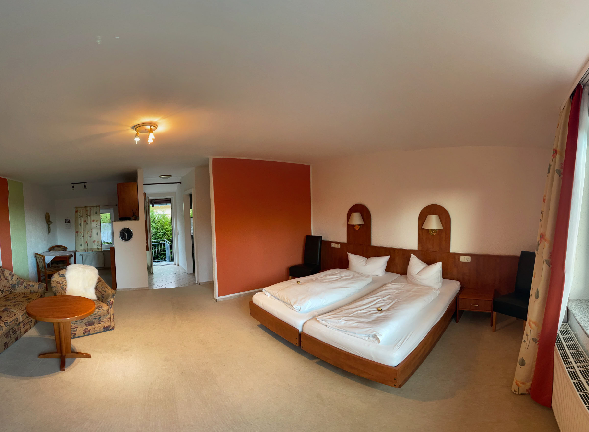 Die individuellen Apartments und Doppelzimmer (55 qm) sind großzügig, modern und wohnlich eingerichtet mit separater Küchenzeile, Satelliten TV, Telefon u.v.m., teilweise behindertengerecht und barrierefrei erreichbar. In herrlicher Südlage mit Panoramablick über die mittelalterliche Kleinstadt und hinein in die zauberhafte Landschaft des Eichsfeldes verfügen sämtliche Zimmer über einen eigenen Balkon bzw. Terrasse.